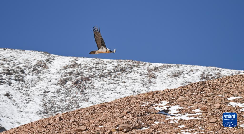 10月18日,在阿尔金山国家级自然保护区,一只胡兀鹫飞过阿木巴勒阿希坎山口。