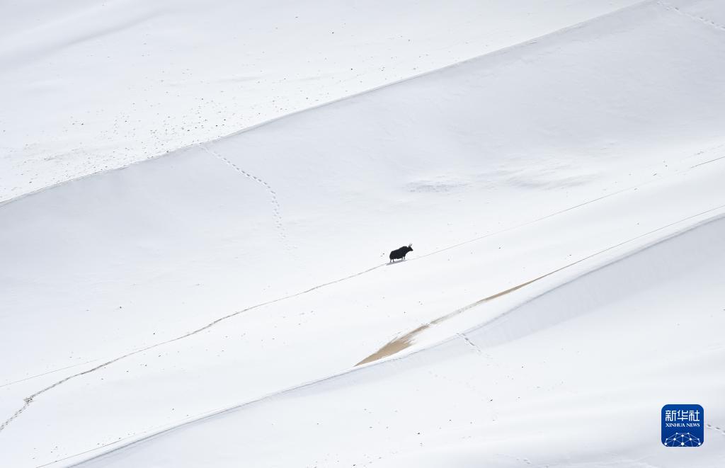 10月16日,在阿尔金山国家级自然保护区,野牦牛攀爬雪后的库木库里沙漠。
