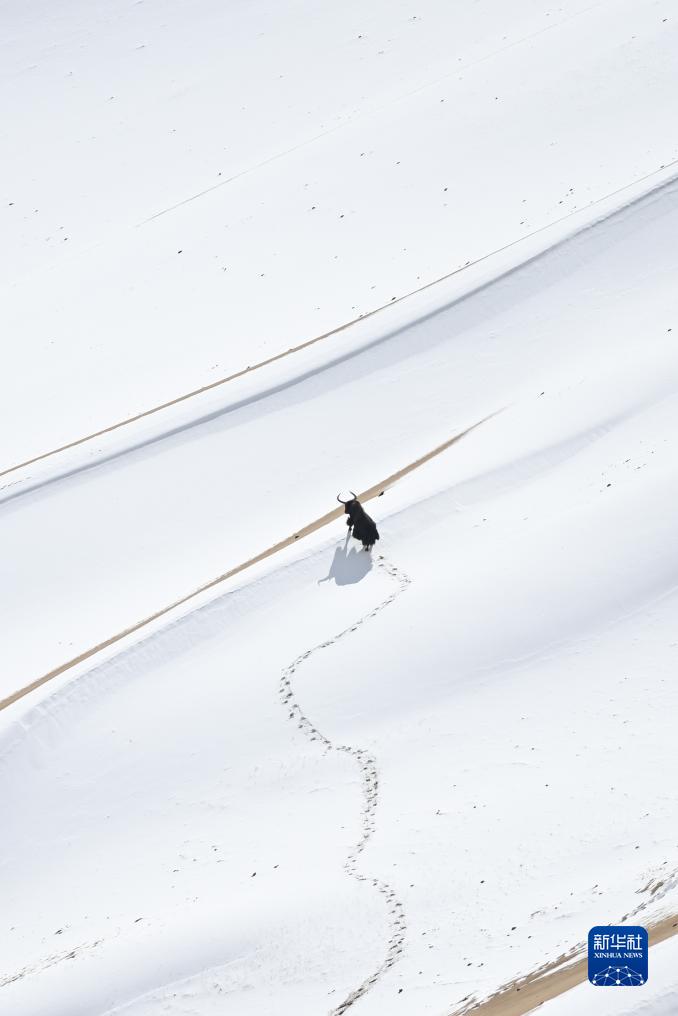 10月16日,在阿尔金山国家级自然保护区,野牦牛攀爬雪后的库木库里沙漠。