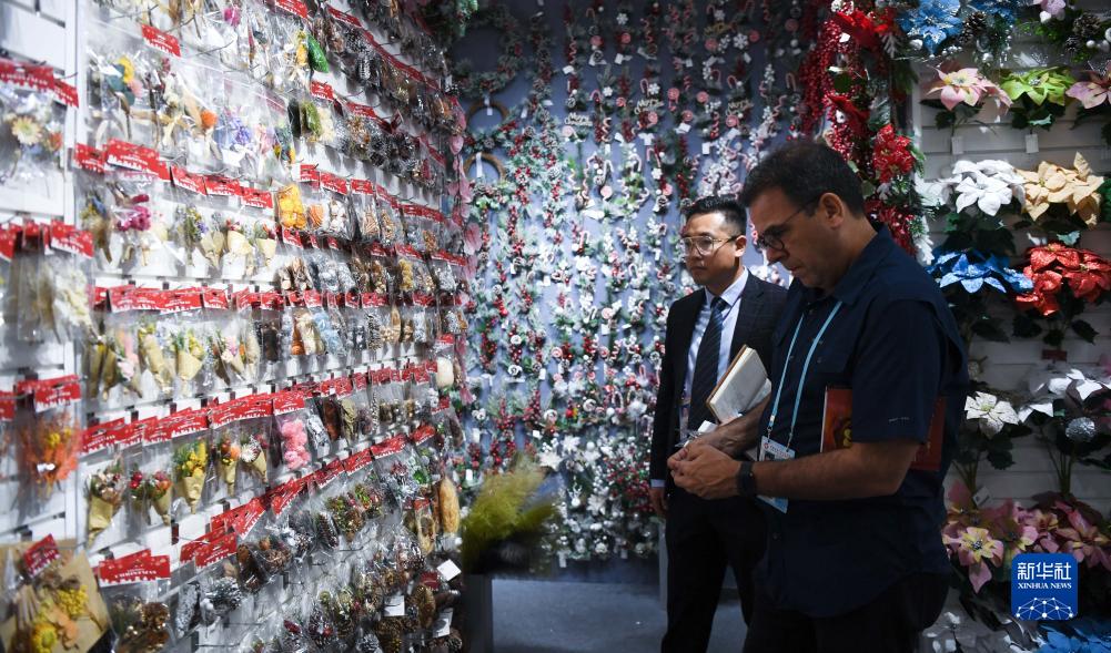 10月23日,外国采购商在饰品展台洽谈业务。