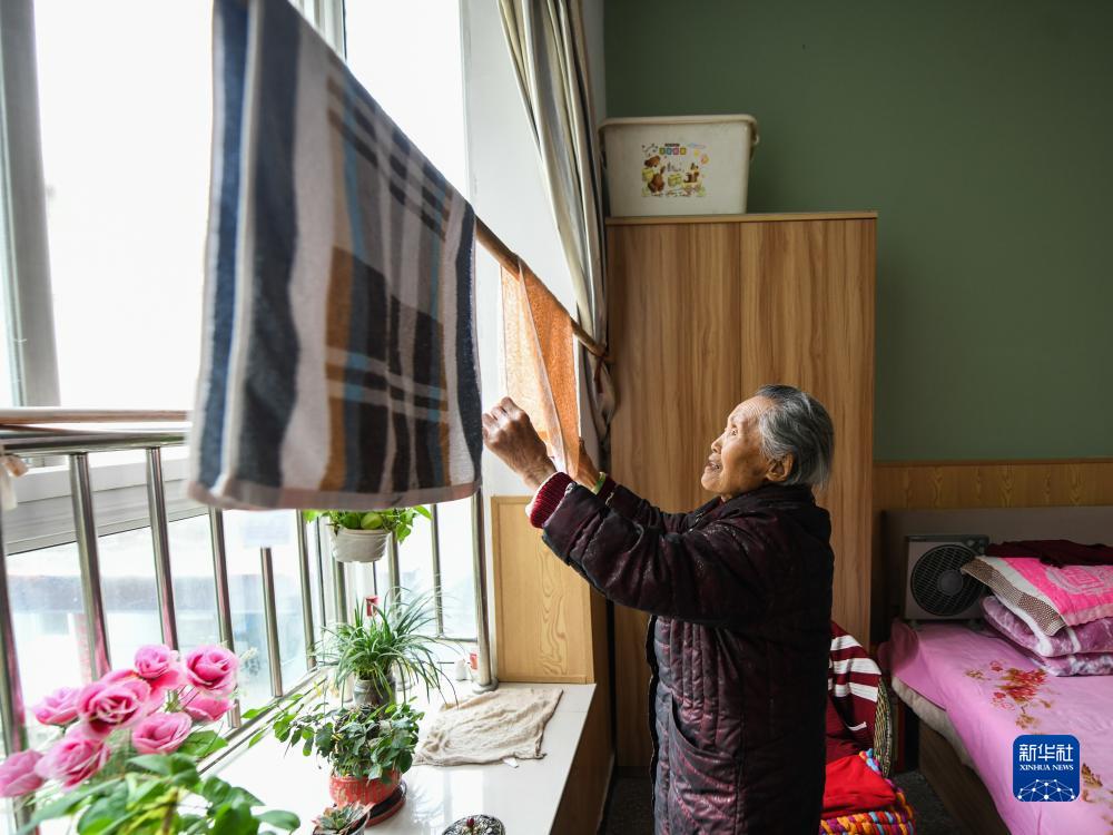 10月20日,在四川省眉山市彭山区社会福利院,赵凤章老奶奶在整理毛巾。
