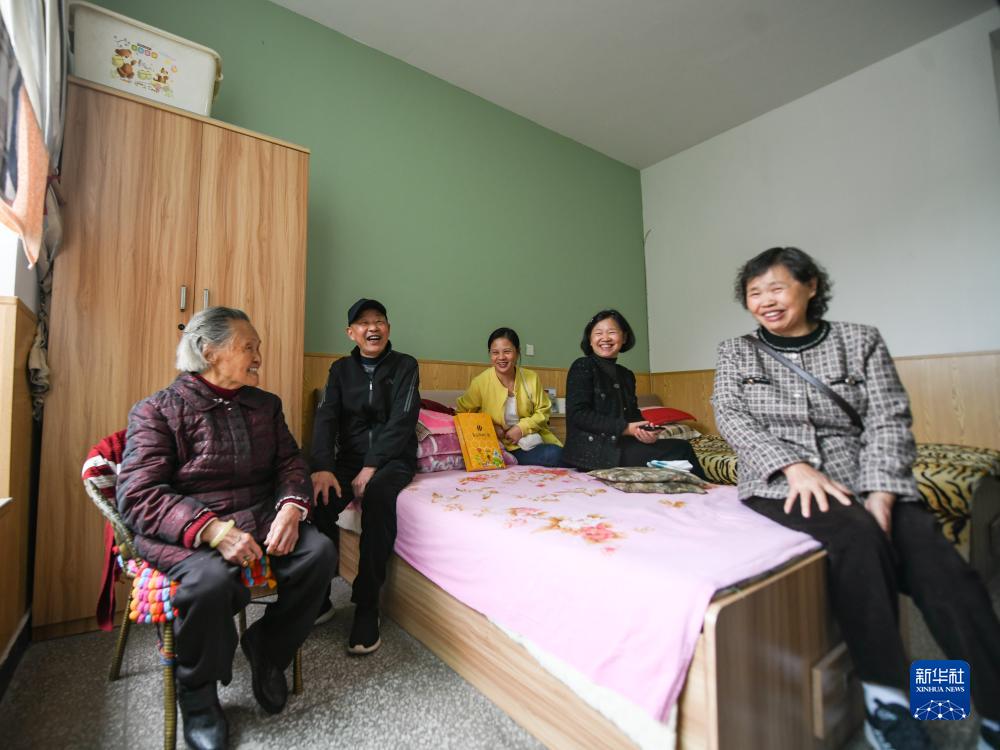 10月20日,在四川省眉山市彭山区社会福利院,赵凤章老奶奶(左一)和前来看望她的家人们聊天。