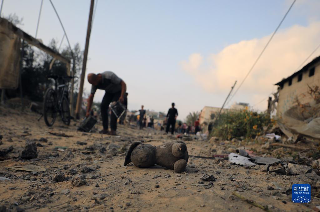 10月23日,人们在加沙地带南部城市汗尤尼斯查看空袭后的建筑废墟。
