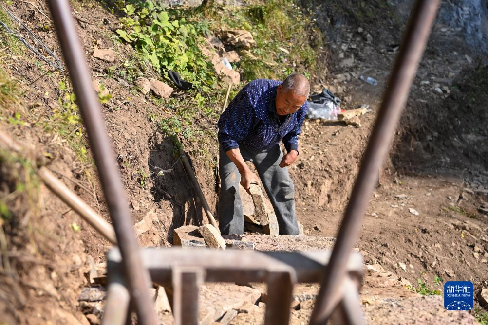 村民王成生在山上搬运石块(10月17日摄)。