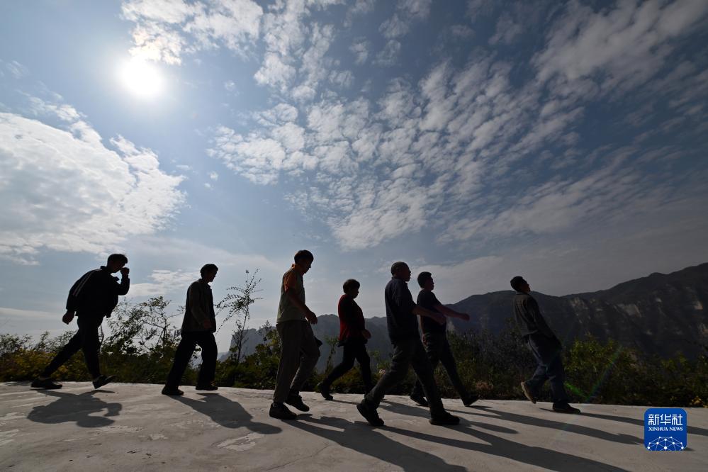在壶关县大峡谷镇青龙峡村,村民们在修路间隙到山下休息(10月17日摄)。
