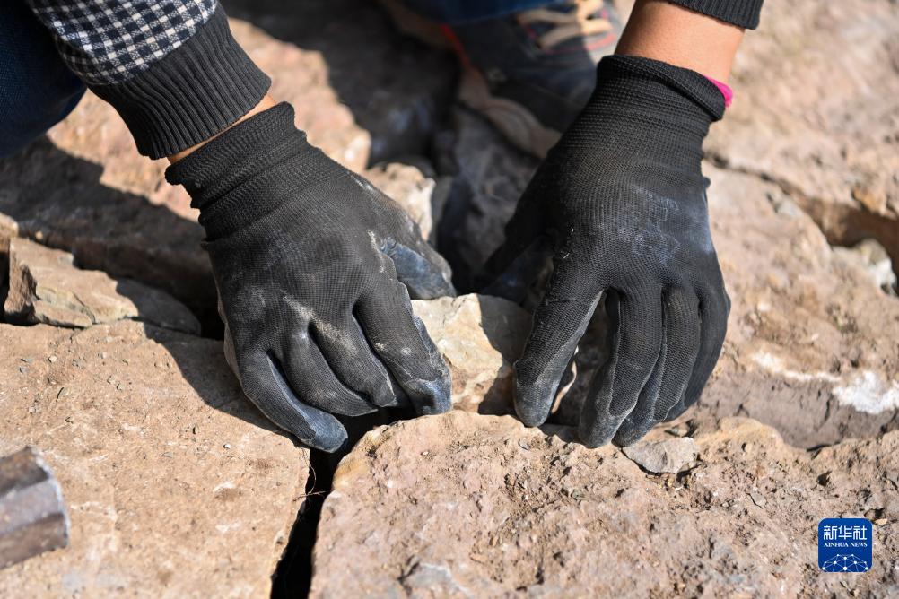 村民在山路上填补石缝(10月17日摄)。