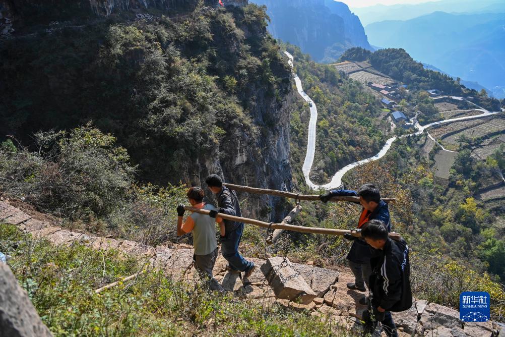 在壶关县大峡谷镇青龙峡村,村民在山间搬运石块(10月17日摄)。