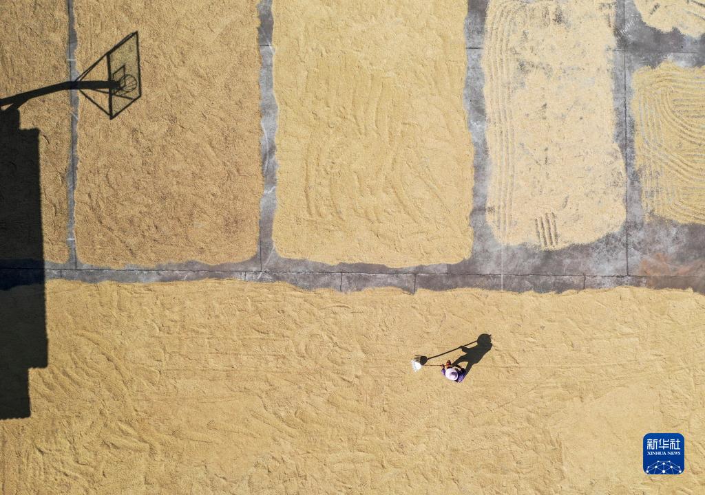 10月24日,广西贵港市港北区大圩镇村民在晾晒稻谷(无人机照片)。