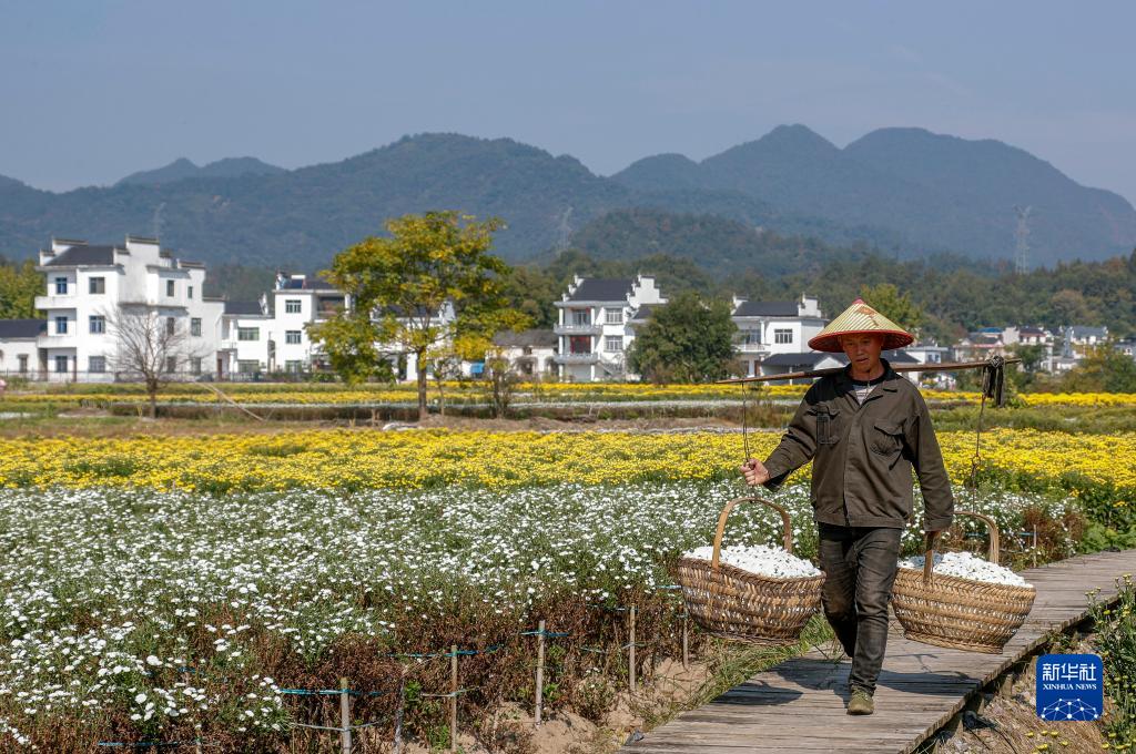 10月24日,安徽省黄山市休宁县盐铺村农民挑运刚收获的徽州贡菊。