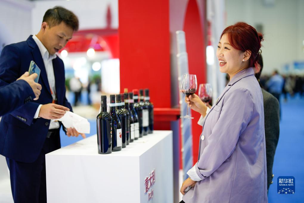 10月24日,参观者在2023中国国际地理标志品牌合作大会上品尝红酒。
