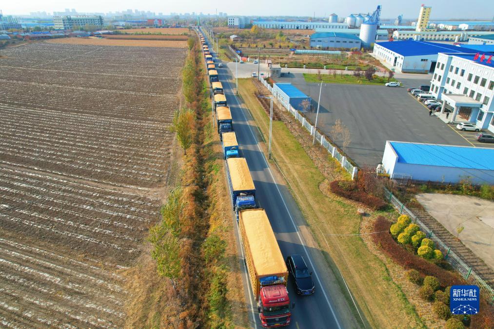 10月24日,送粮车在黑龙江省富锦市一大型粮食仓储加工企业外排起长队(无人机照片)。