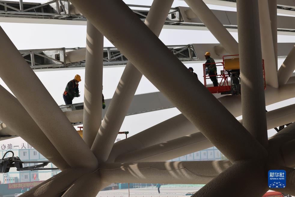 工人在雄安体育中心体育场施工(10月24日摄)。