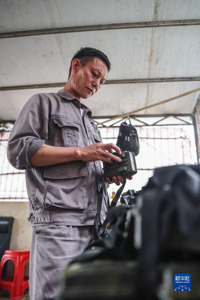 10月18日,海南长臂猿监测队队员李文永在家中检查红外相机。
