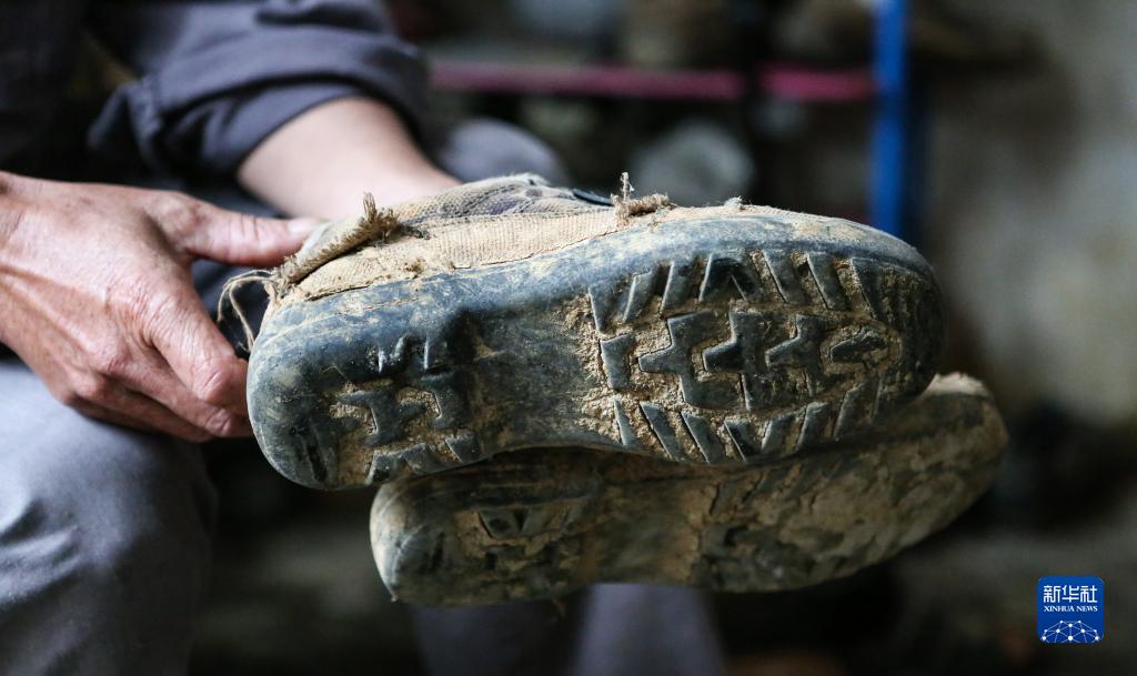 10月18日,海南长臂猿监测队队员李文永展示一双因长期上山而穿烂的鞋。