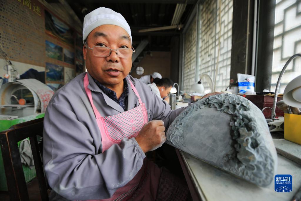 10月24日,艺人在甘肃省定西市临洮县洮砚艺术馆介绍一款洮砚的创作构想。