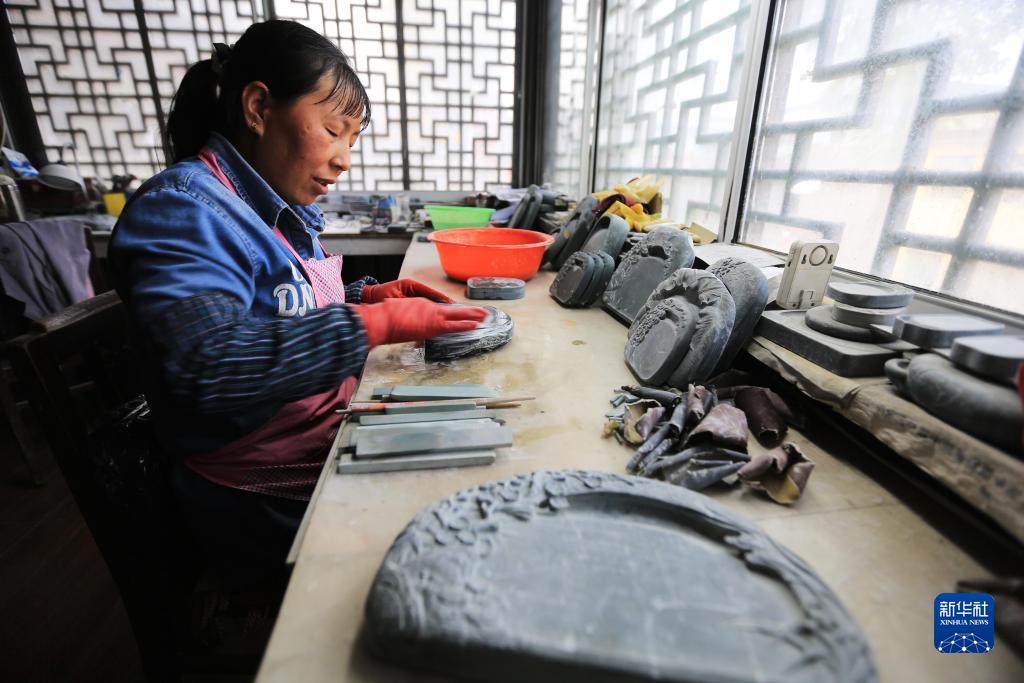 10月24日,艺人在甘肃省定西市临洮县洮砚艺术馆打磨洮砚。