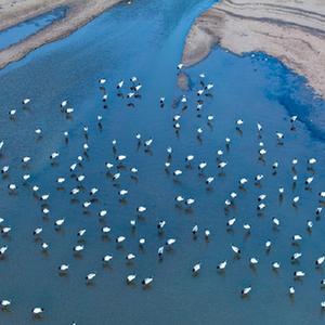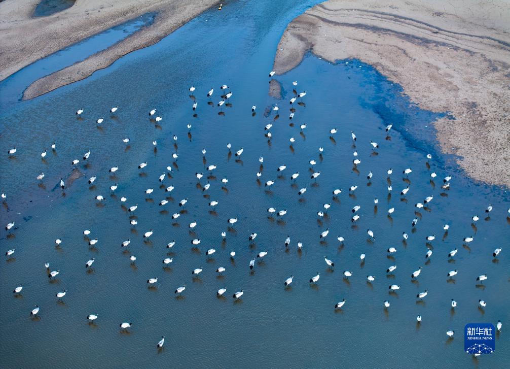 这是在拉萨市林周县虎头山水库拍摄的越冬黑颈鹤(10月24日摄,无人机照片)。