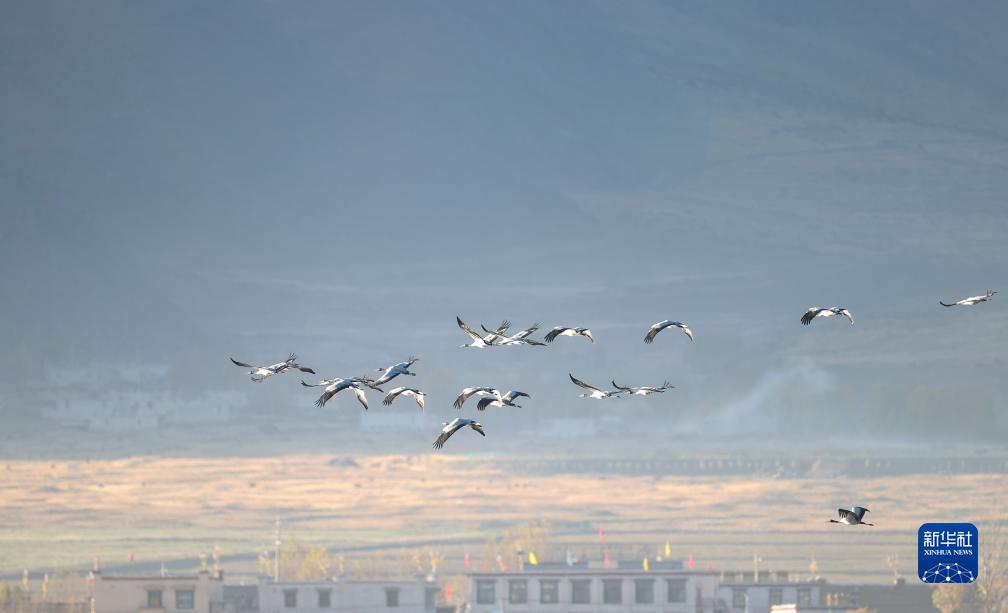 10月下旬,西藏自治区拉萨市林周县迎来2023年第一批越冬黑颈鹤。它们将在这里一直待到来年三四月份。黑颈鹤是国家一级保护动物,主要栖息在海拔2500米至5000米的高原、草甸、沼泽地带。拉萨北部的林周县平均海拔约4200米,是黑颈鹤的主要越冬地之一。
