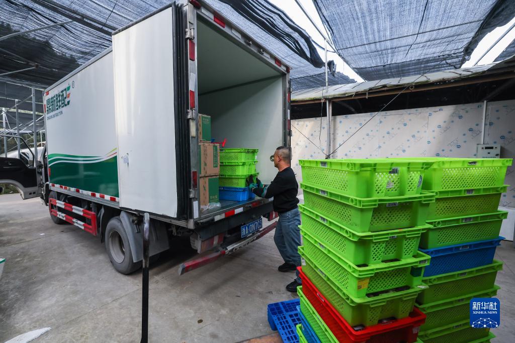 10月25日,在杭州市临安区玲珑街道双源村的鼎新农业基地食用菌共富工坊,工人把当天采收的菌菇装车运往杭州城区。该农业基地以培育、种植食用菌为主,为当地提供就业岗位60余个。