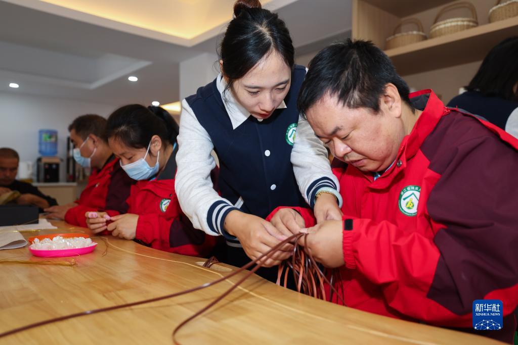 10月25日,党员志愿者在杭州市临安区玲珑街道玲溪社区党群服务中心共富工坊指导工人加工手工艺品。该工坊提供轻强度手工的辅助性就业岗位,目前已有46名残疾人在这里实现家门口就业。