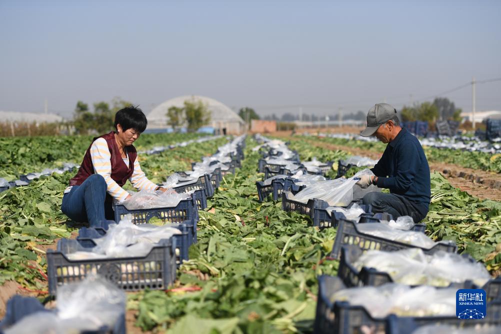 10月25日,辛集市辛集镇辛洲蔬菜种植基地的工人在打包萝卜。该基地种植的萝卜按订单销往日本。