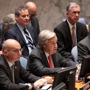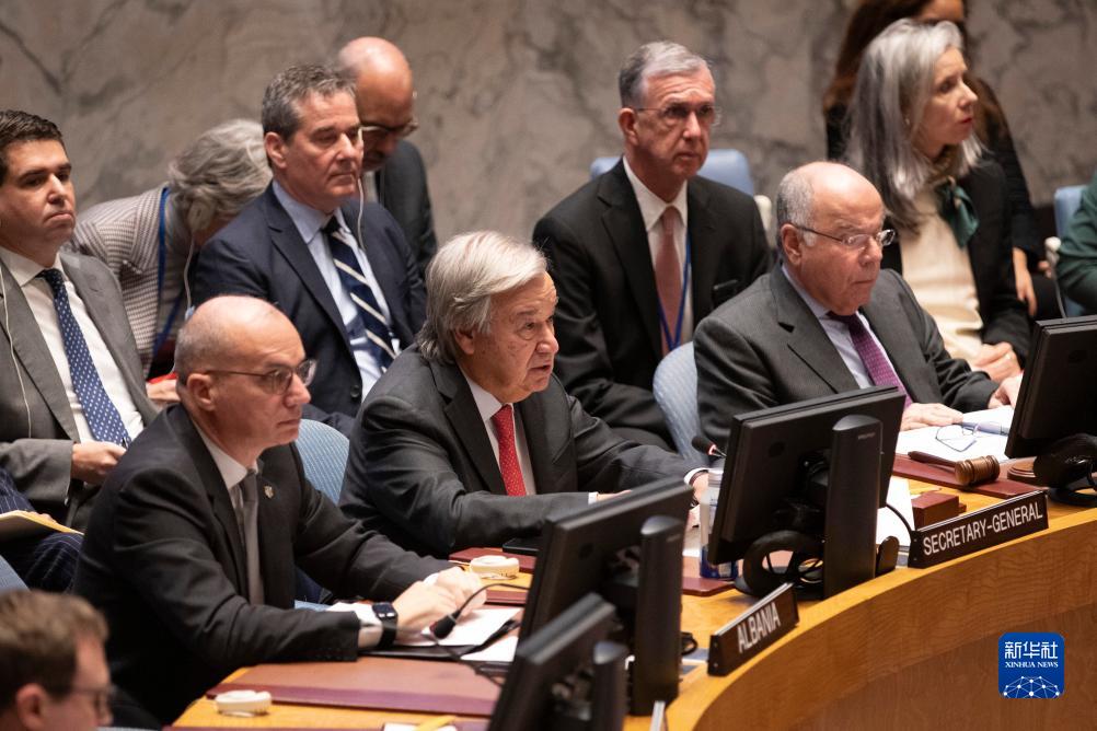 10月24日,在位于纽约的联合国总部,联合国秘书长古特雷斯(前中)在安理会巴以局势高级别会议上讲话。