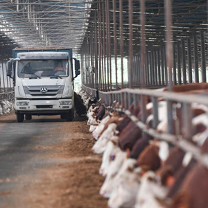 10月23日,在重庆市丰都县高家镇厚池坝村肉牛育肥场,工作人员驾驶撒料车给肉牛投料。