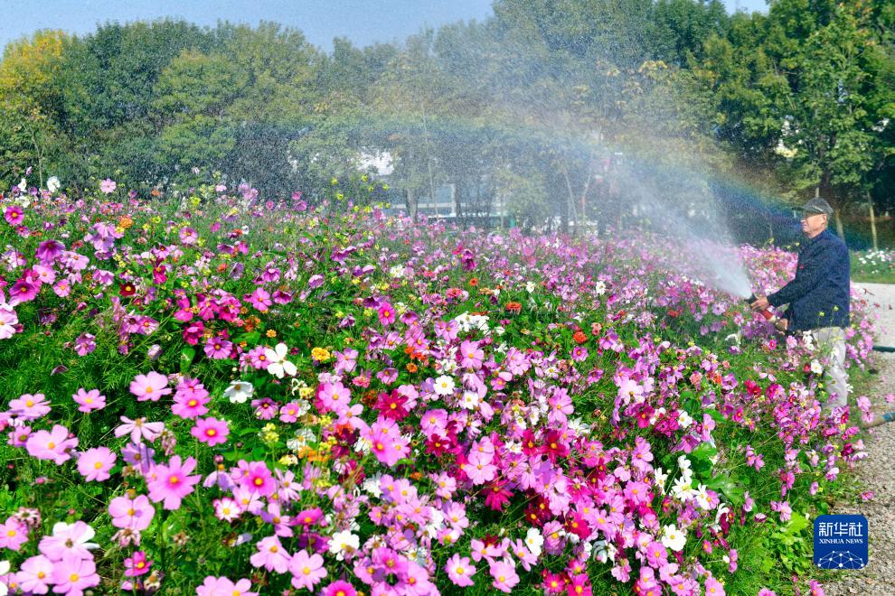 10月25日,工作人员在养护日照市东港区碳汇花海。