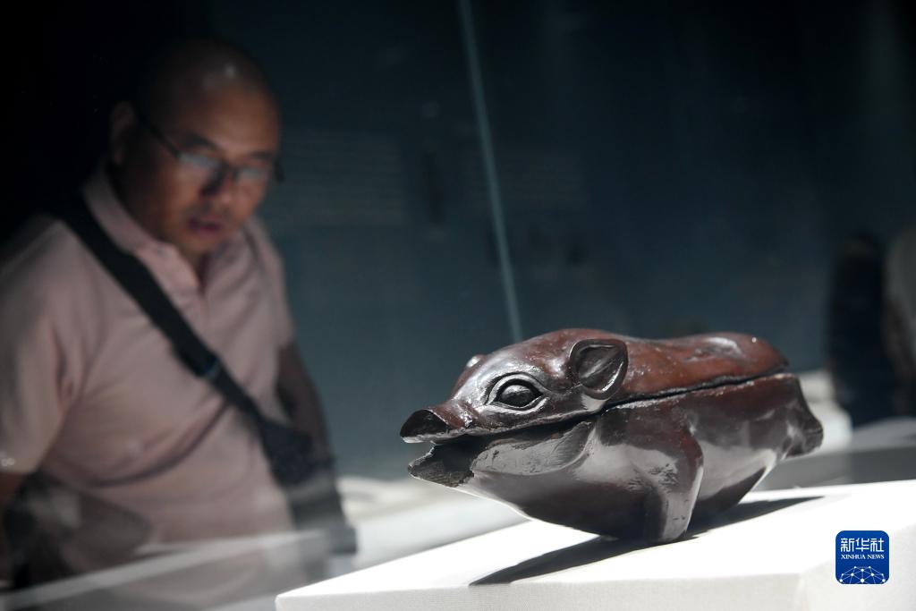 10月25日,观众在秦始皇帝陵博物院观看荆州博物馆馆藏文物猪形漆盒。