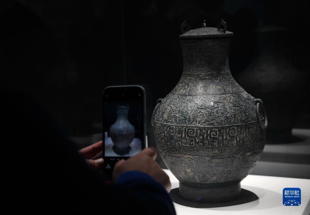 10月25日,观众在秦始皇帝陵博物院观看成都博物馆馆藏文物狩猎纹铜壶。