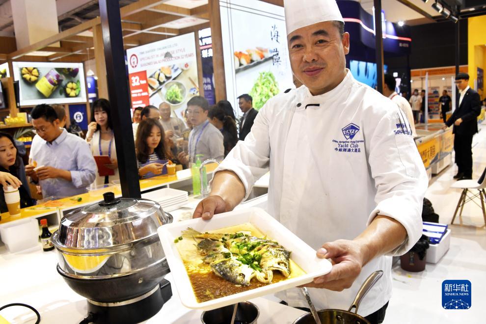 10月25日,参展企业的厨师在渔业博览会上加工水产品。