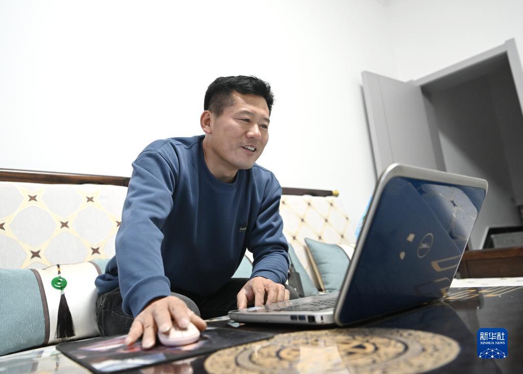 10月24日,韩战桥在雄安新区安新县家中用电脑整理照片。