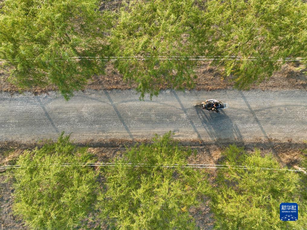 10月24日,韩战桥在雄安新区孝义河河口湿地骑摩托车巡护(无人机照片)。