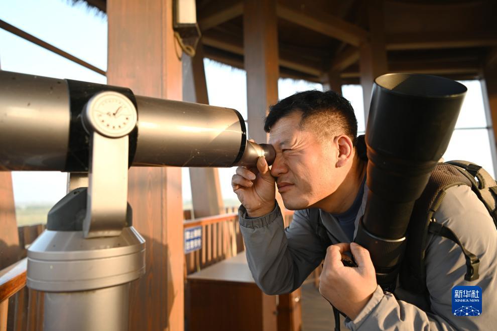 10月24日,韩战桥在雄安新区孝义河河口湿地瞭望塔上用望远镜观测野生鸟类。