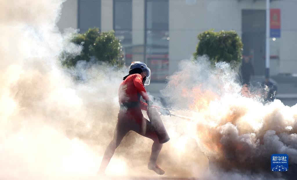 10月25日,消防员在闭幕式上演示扑灭油池火。