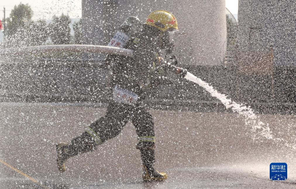 10月25日,消防员在闭幕式上演示枪炮协同灭火。