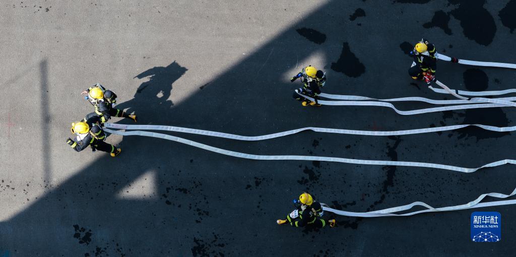 参赛选手在进行枪炮协同灭火项目比武(10月22日摄)。
