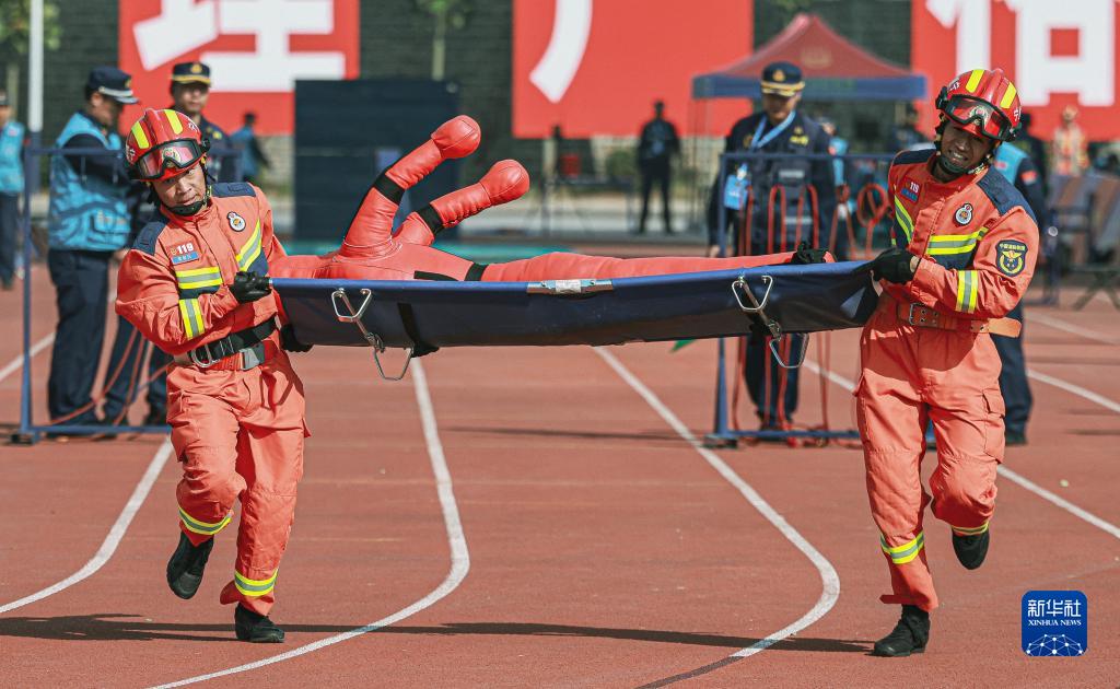 参赛选手在进行百米障碍救助项目比武(10月23日摄)。