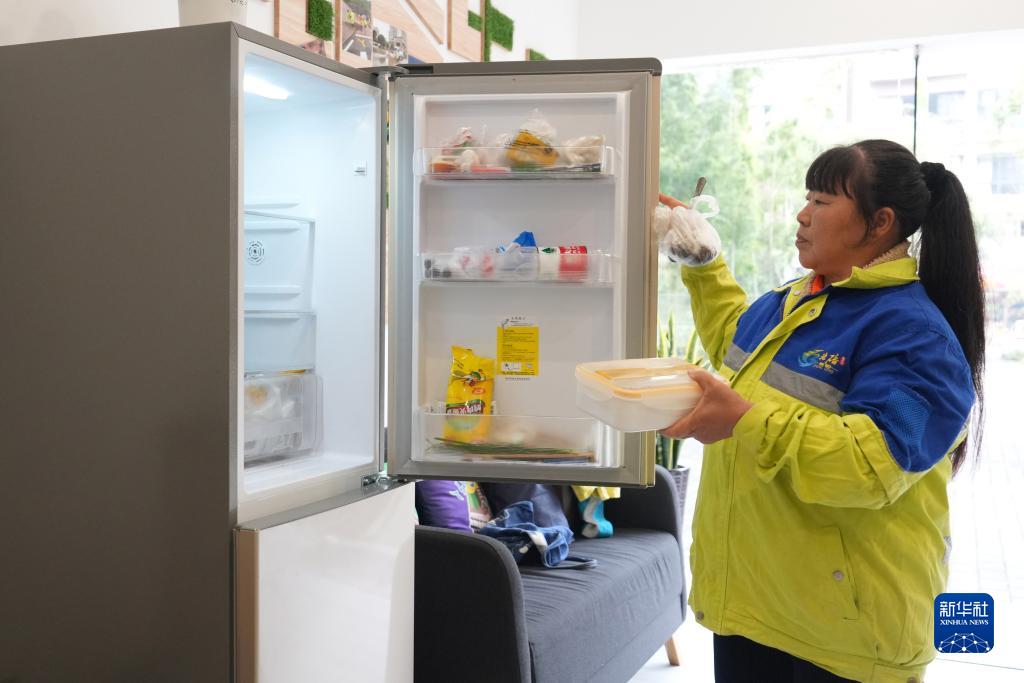 10月25日,在重庆市北碚区云清路“劳动者港湾”,一名环卫工人从冰箱内取出午饭准备加热。