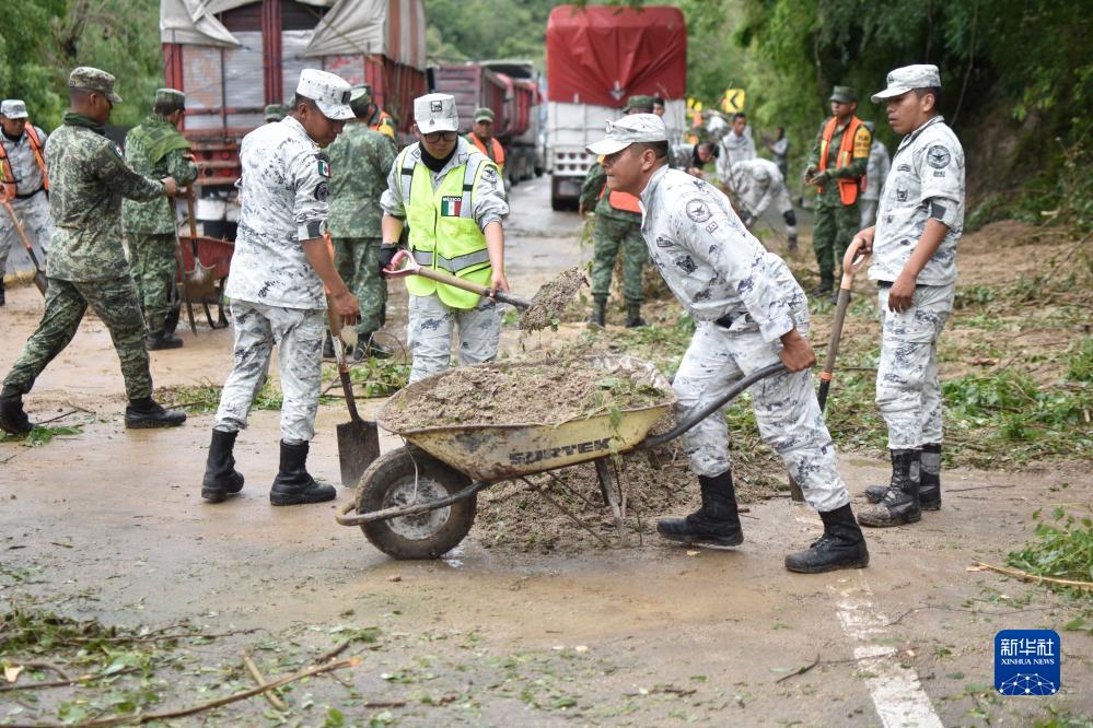 10月25日,在墨西哥格雷罗州奇尔潘辛戈市,军人和国民警卫队清理因飓风“奥蒂斯”过境而堵塞的道路。