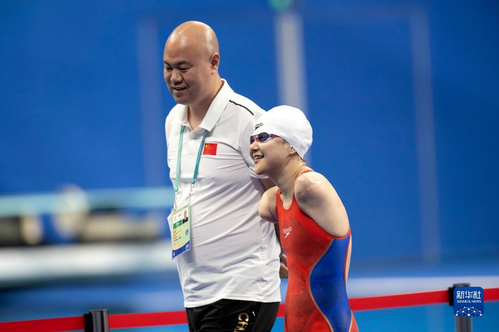 10月25日,卢冬(右)在杭州第4届亚残运会女子50米蝶泳S6级决赛后笑着与教练李健辉离开赛场。她最终获得第四名的成绩。
