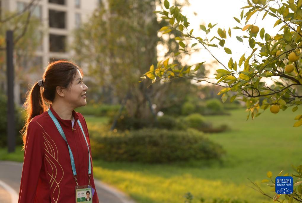 10月23日,卢冬在杭州亚残运会运动员村内散步。