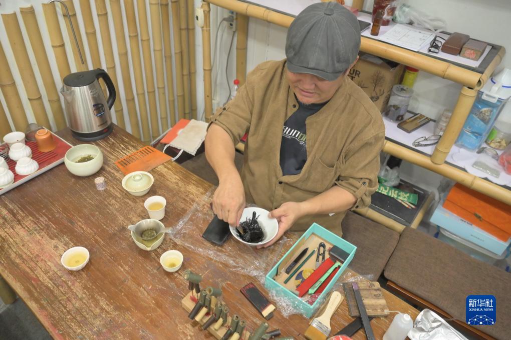 10月25日,黄守堃在调配大漆。