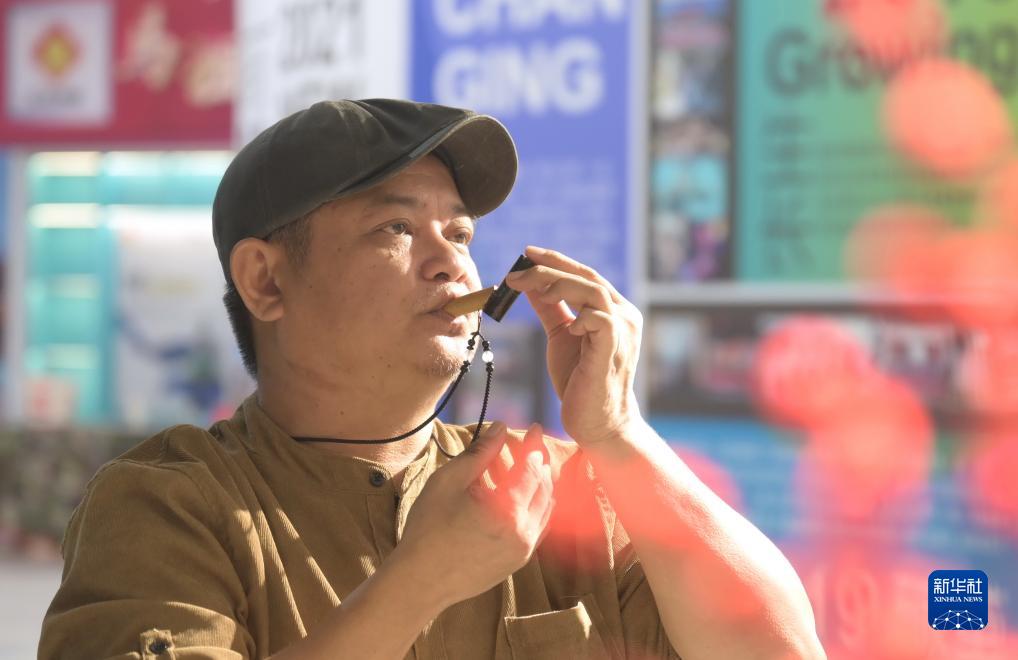 10月25日,黄守堃在演奏漆艺竹鸟笛。