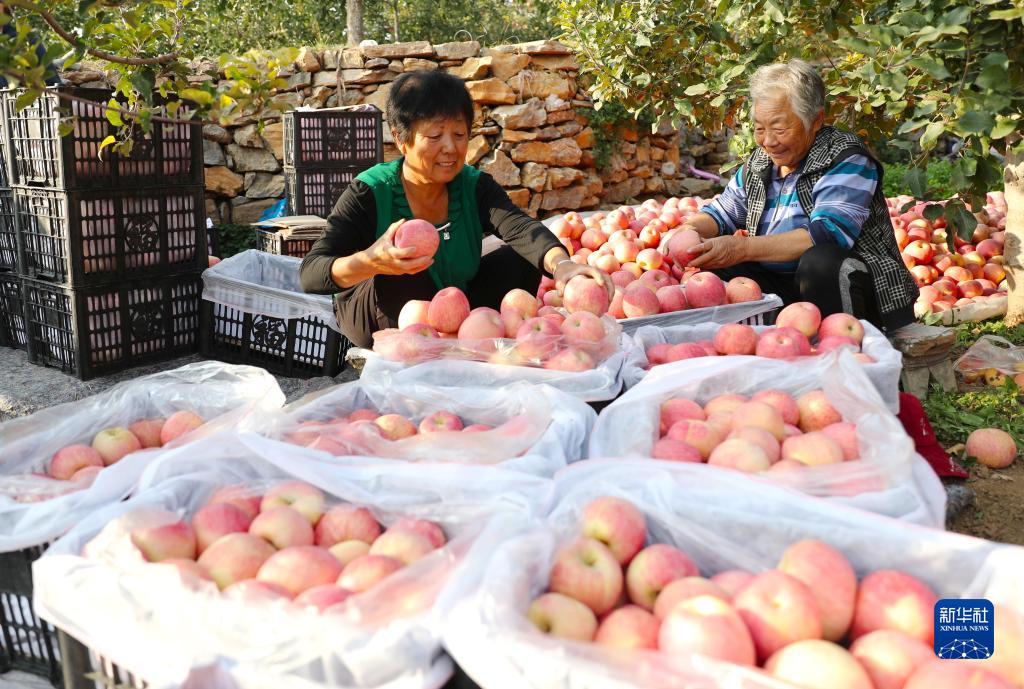 10月26日,河北顺平县南神南村果农在果园分拣采摘的苹果。