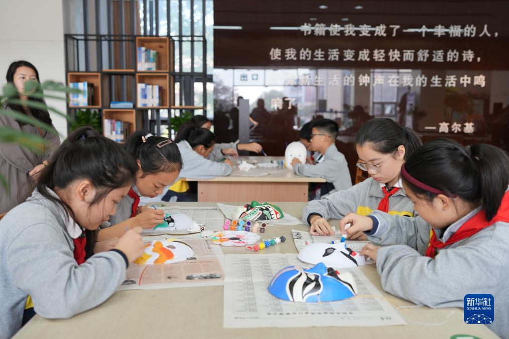 10月25日,在位于湖州市环渚街道的京剧服饰艺术馆,湖师附小幸福里校区的小朋友用画笔描绘京剧脸谱。