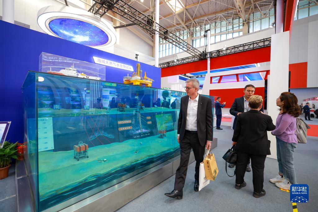 10月26日,在天津梅江会展中心,观众在国际矿业展览会上参观海域矿产资源开采模型。