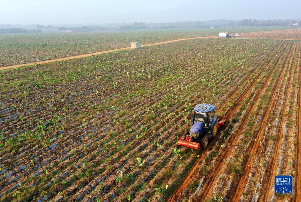 10月26日,农机在青岛市即墨区金口镇的田间收获芋头(无人机照片)。