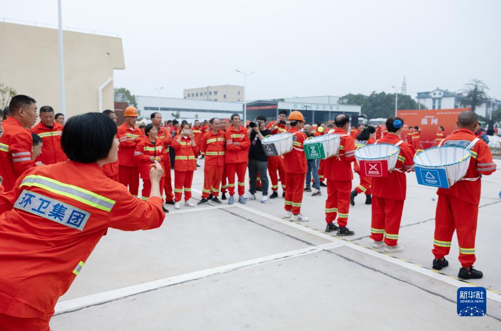 10月26日,浙江省诸暨市的环卫工人参加垃圾分类投球比赛。