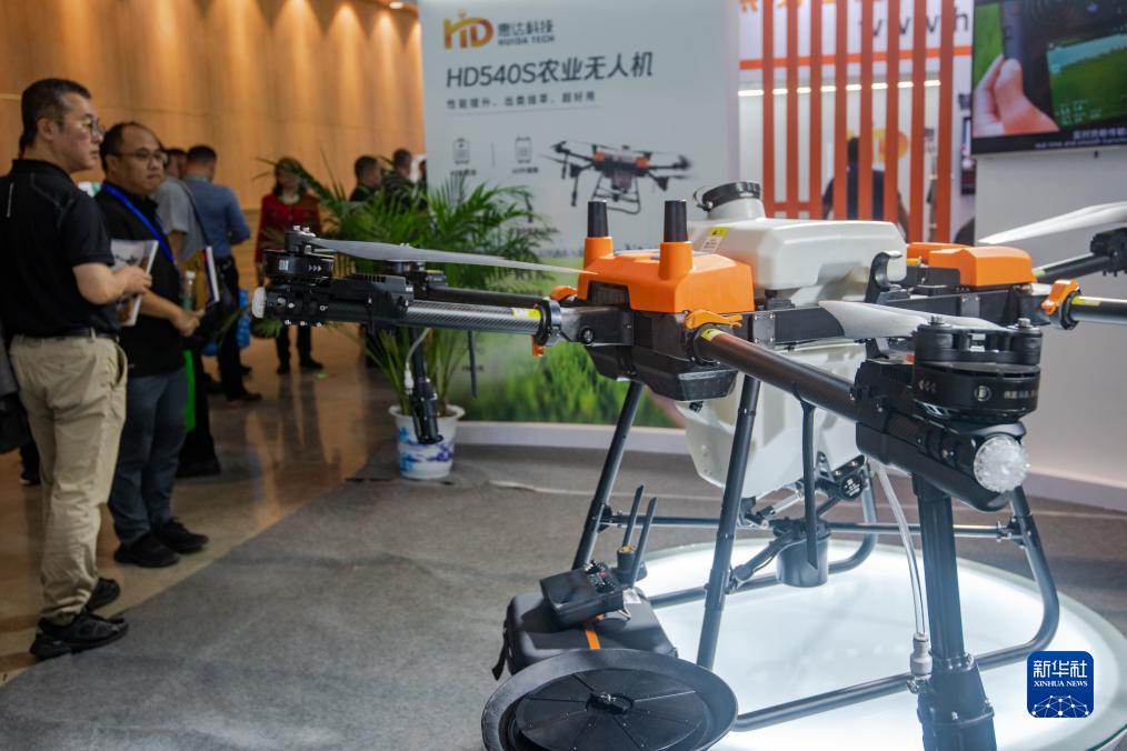 10月26日,观众在2023中国国际农业机械展览会现场参观农业无人机。